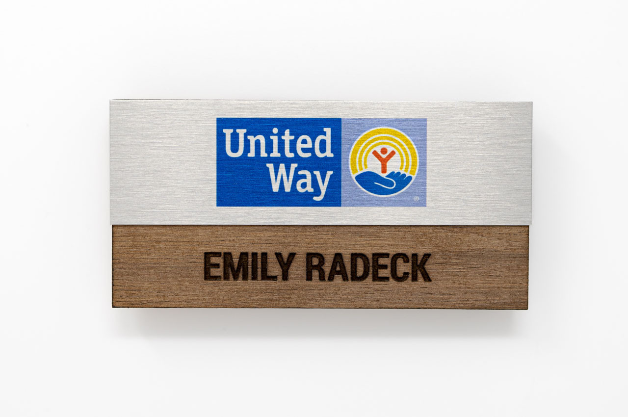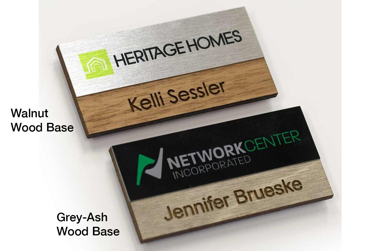 Looking to stand out at your next company function or public event? Our Wooden and Metal Name Badges include a metal plate, in full color, adhered to a real walnut-toned wood name badge. These provide a unique, professional accented look with the use of both metal and wood. View more of our unique, custom name tags.