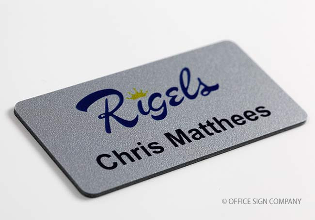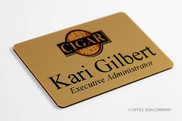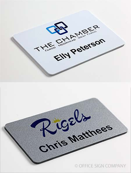 Durable, laminated plastic, full color name tags with an attractive finish. 1/16" deep metallic silver and metallic gold finishes. Also available in white with custom colors available by request. Laminated surface protects imprint and provides UV stability