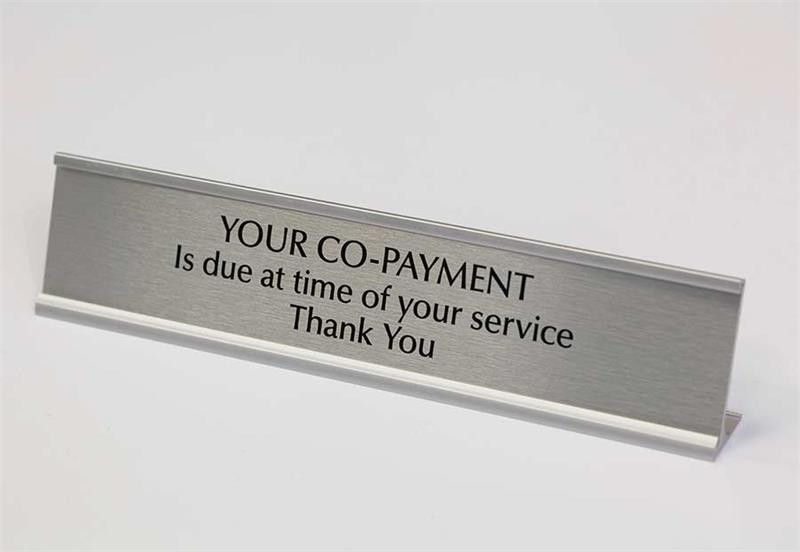 Ideal for copay signs or with any custom text you desire. Custom desk signs and signs for counter and front office.Signs for Work - Desk signs, copay signs or custom text with satin silver frames and free custom text & logos