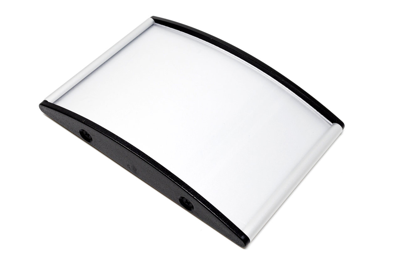 Extra large interchangeable curved signs with metal frames and high-impact plastic end caps are great for displays, directories, reception signs and way-finding signage. Choose from a black powder-coated or satin silver anodized frame and black or grey end caps.