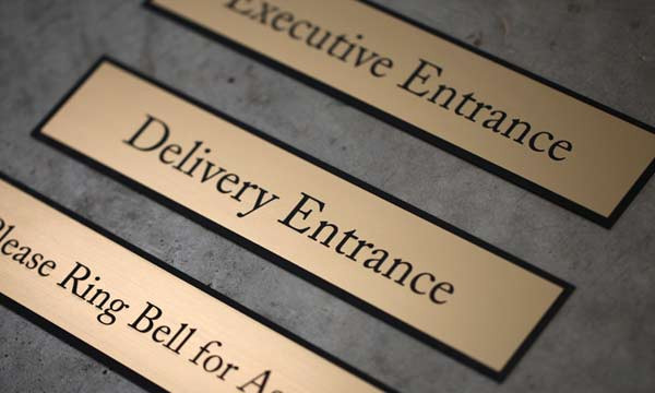 Frameless engraved office signs, name plates and door signs suitable for interior and exterior signage needs. Available in virtually any size and any color. Sign plates are 1/16" thick. Free text and logo personalization.