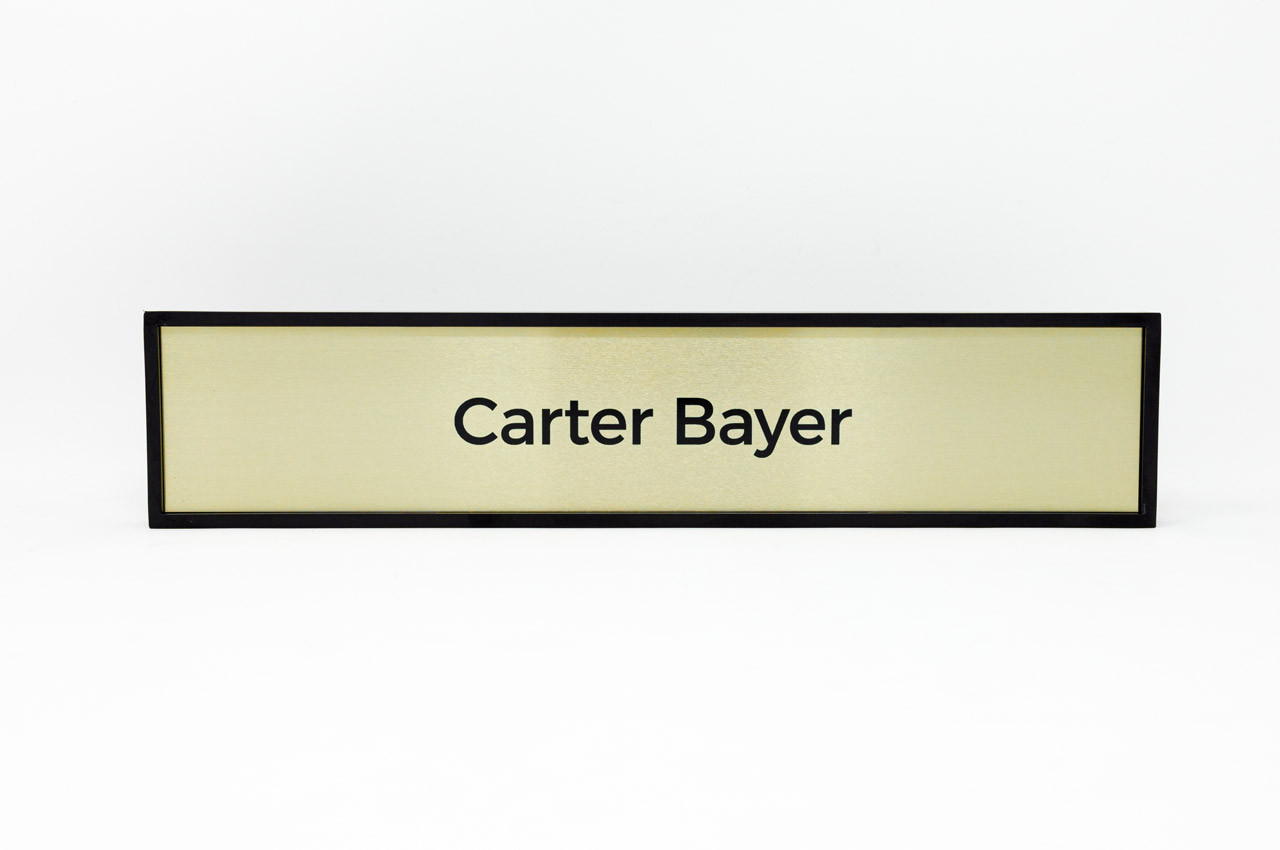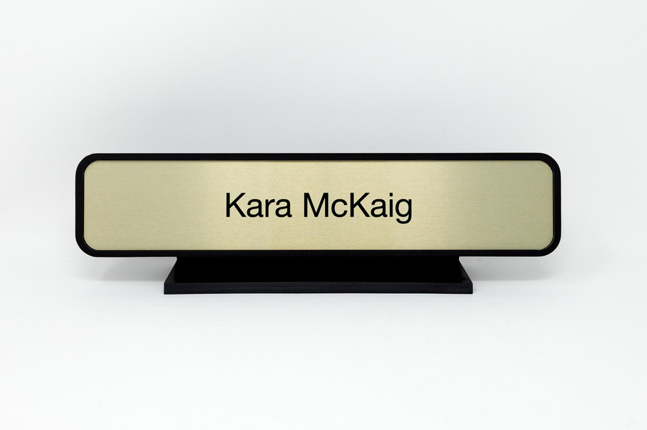 Custom office deskbar nameplate with stand - Black frame and black stand included. Other frame and stand colors available upon request.