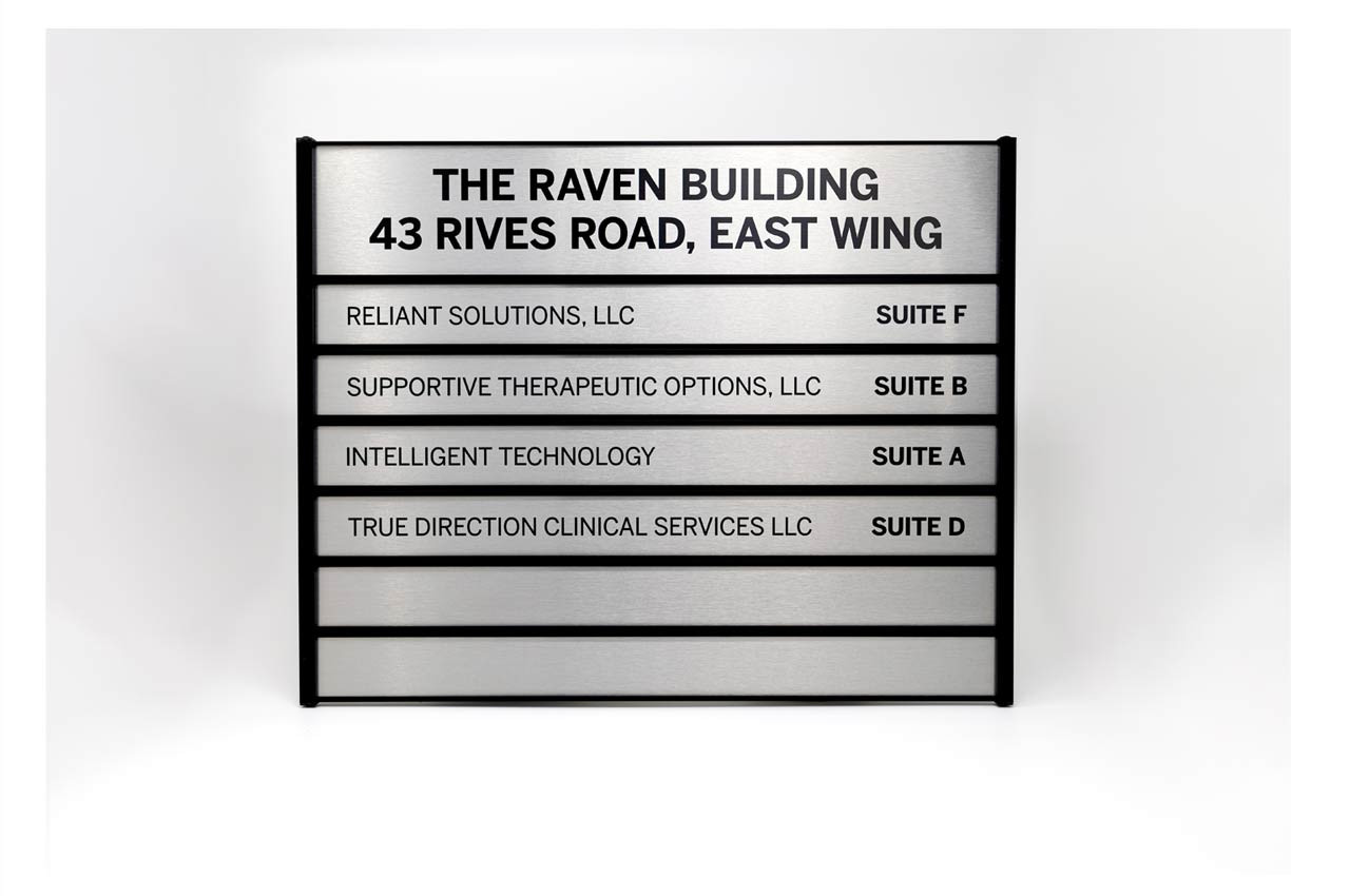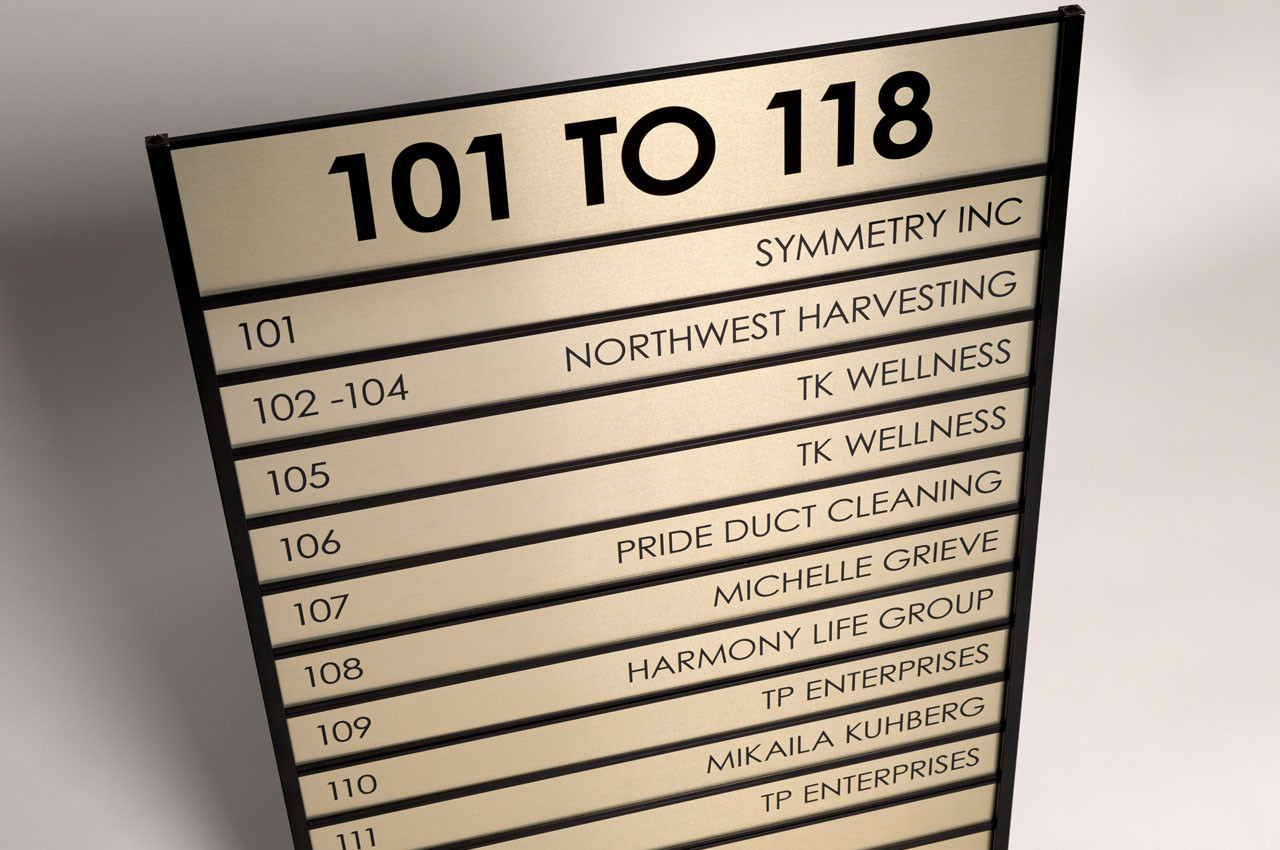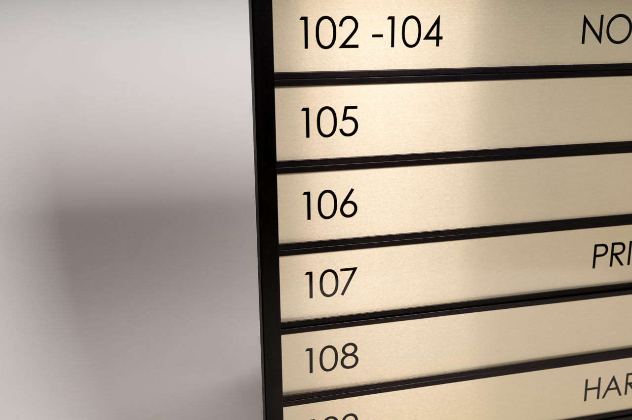 Display medical directions, room numbers and tenant names with our wayfinding directory signs. Removable and replaceable sign plate units makes changing any one of the suite numbers or room name plates convenient. A clean, professional directory sign that's easy to use and easy to update. A unique wayfinding sign used by building contractors, property owners, apartments and building management.