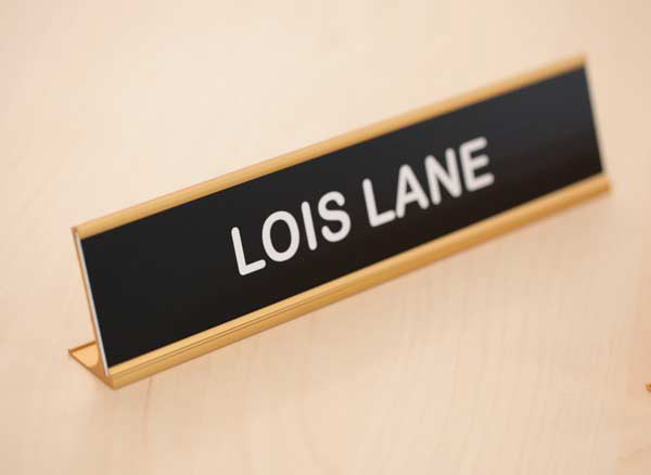 10x2 custom engraved door sign - desk, wall or door mount office name plate sign with free text and company logo personalization. Architectural grade metal sign holder in satin gold or a shiny, polished gold - with custom name plate insert.