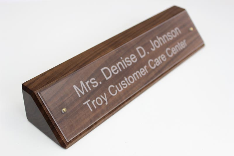A laser-etched name plate offers a crisp, beautiful frosted look to your custom text. Nameplate includes a slightly beveled edge and is attached to a rich walnut base with two small screws to add a subtle touch of class to your desk sign.