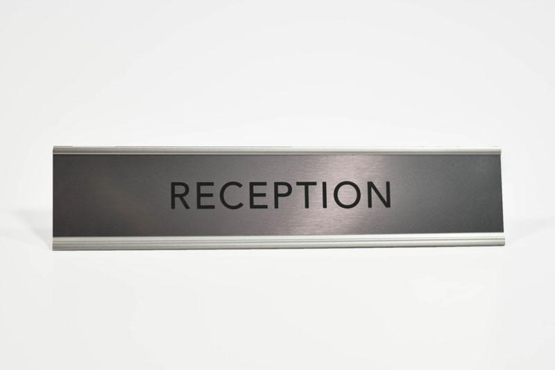 10"W x 2"H custom engraved door sign and engraved desk office sign with free text and company logo personalization. Architectural grade metal sign holder in matte black or silver frame, your choice - with custom name plate insert.