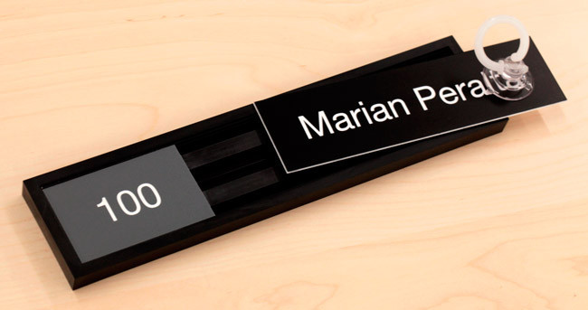 The name area of our signs are easily removed and replaced with a suction cup, making these an economical choice for changing personnel titles, employee names and office names. Room number and name plates available in many color combinations.