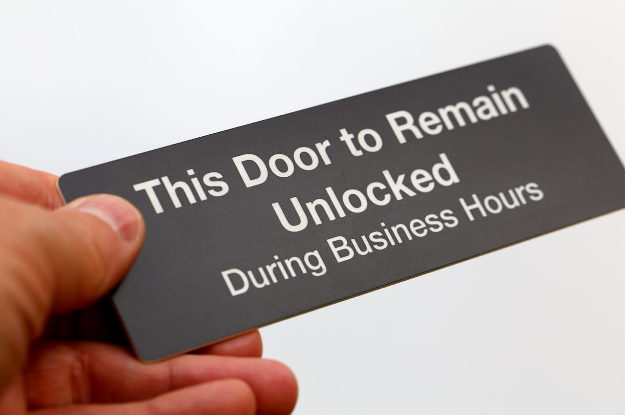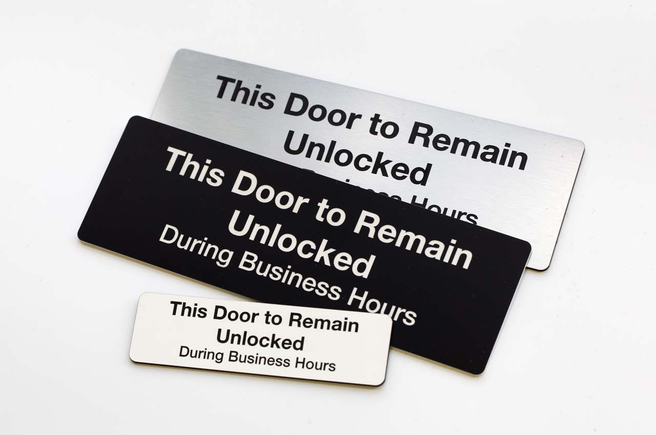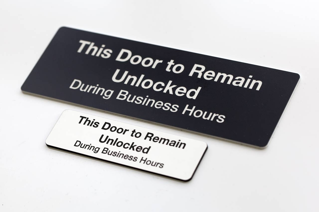 Engraved office and door signs, that read: This Door to Remain Unlocked During Business Hours. Remind employees and visitors alike, to keep any preferred door unlocked during operating hours.
