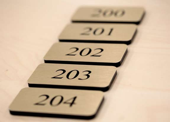 Our contemporary office sign design features a rich black 1/4" thick backer piece to give your signs a hint of depth and style. Ideal for office doors, exam rooms,medical waiting room signs , doctor's offices, room numbers, employees only signs, no cell phone signs and anything you can think of! Our professional architectural office signs and logo signs are a favorite among law firms, interior designers, dentists, health care and medical facilities. Rounded or squared corner sign options.