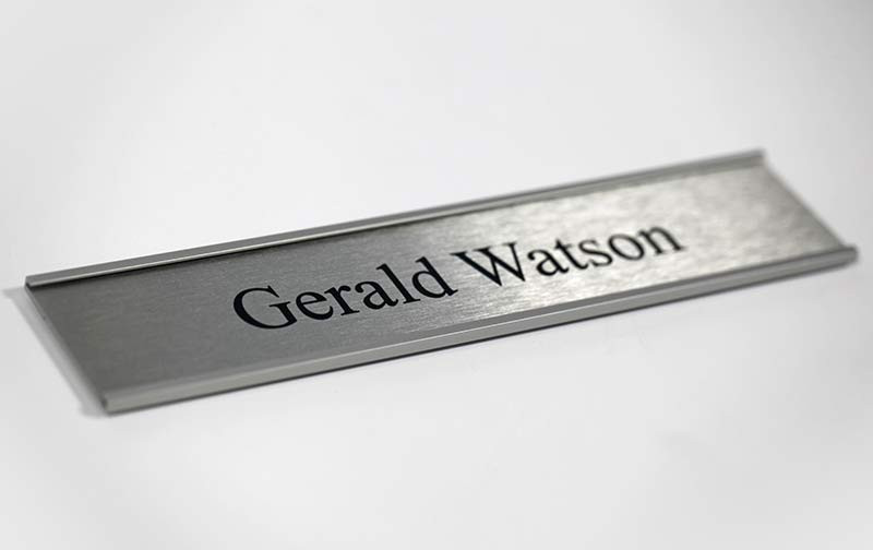 These office interior signs feature an open-frame design that can also allow for interchangeable signs. Suitable for board rooms, cubicles, doors and corporate offices seeking a crisp, clean office sign. Create your office sign with black text (or any color text) or include your company logo, no setup fees or charges for custom text or logos.Satin silver office signs, employee signs and corporate nameplates are ideal for medical office signs, doctors' offices, lawyers and professionals