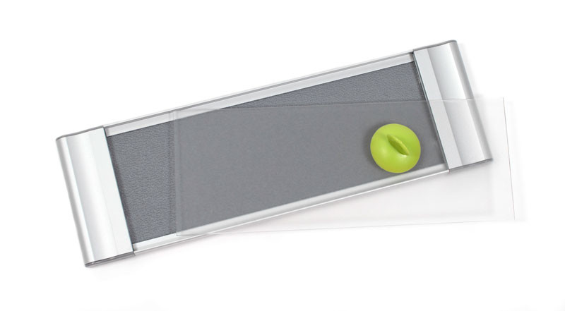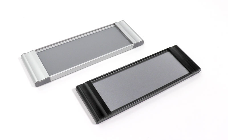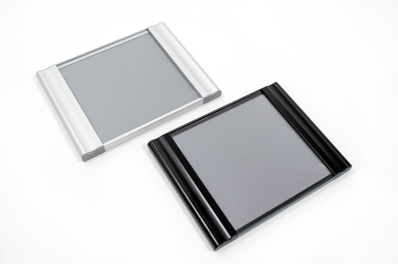 These metal frames include high impact plastic end caps along with a matte clear lens to protect the inserts. A suction cup is included to help remove the lens from the frame. Available in satin silver or matte black anodized aluminum.