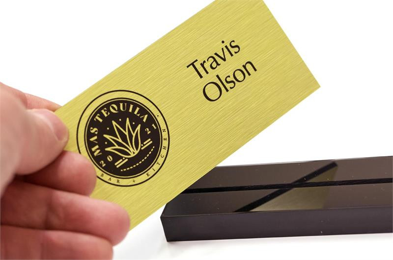 Your custom message and/or logo printed on brushed metal placards (1/8" thick). 2"H X 4"W Placards are replaceable and removable. The flame-polished acrylic base measures approximately 1/2" High.