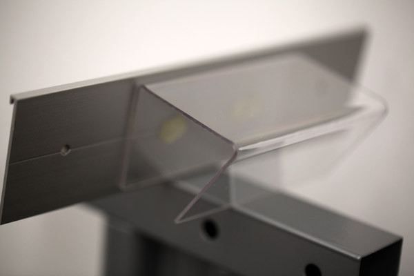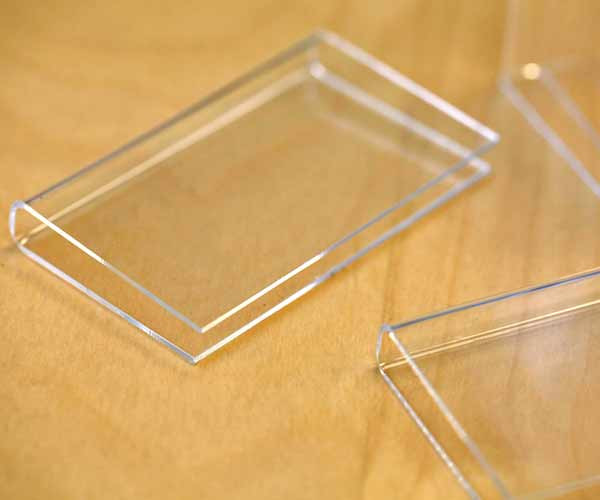 Our stock acrylic hangers (1/16" thickness) come in black or clear in a variety of sizes so you can adhere your nameplates and hang them on your cubicle wall without having to pin into the fabric. Custom sizes and colors are available upon request, so contact our Customer Service Team for pricing and ordering. The clear material will complement office signs of any color.