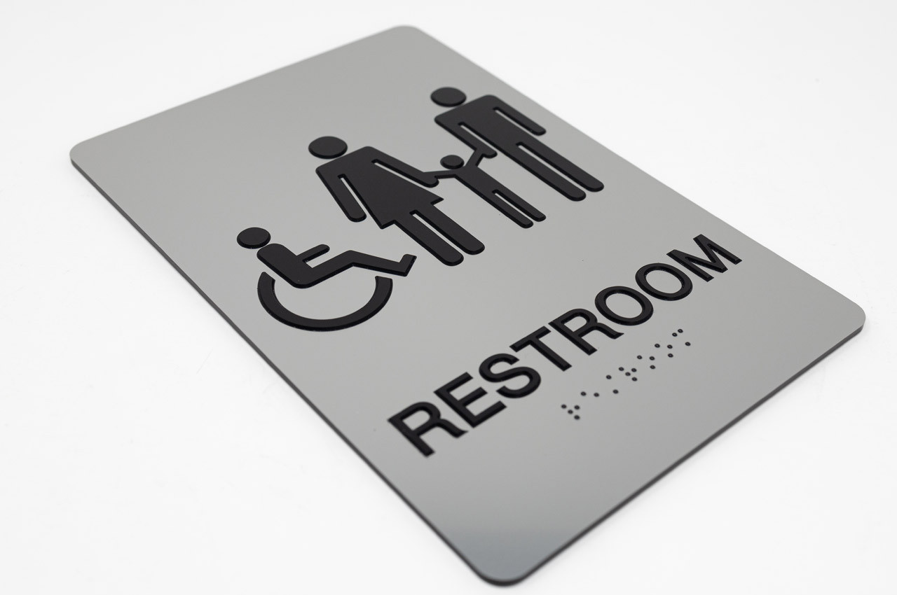 Each sign includes ADA compliant tactile lettering and graphics and Grade 2 braille. Choose the appropriate graphic for a men's bathroom sign, women's restroom sign or a unisex bathroom sign. Each graphic is also available for handicap accessible bathrooms.Premium ADA Braille Restroom Signs & Bathroom Markers